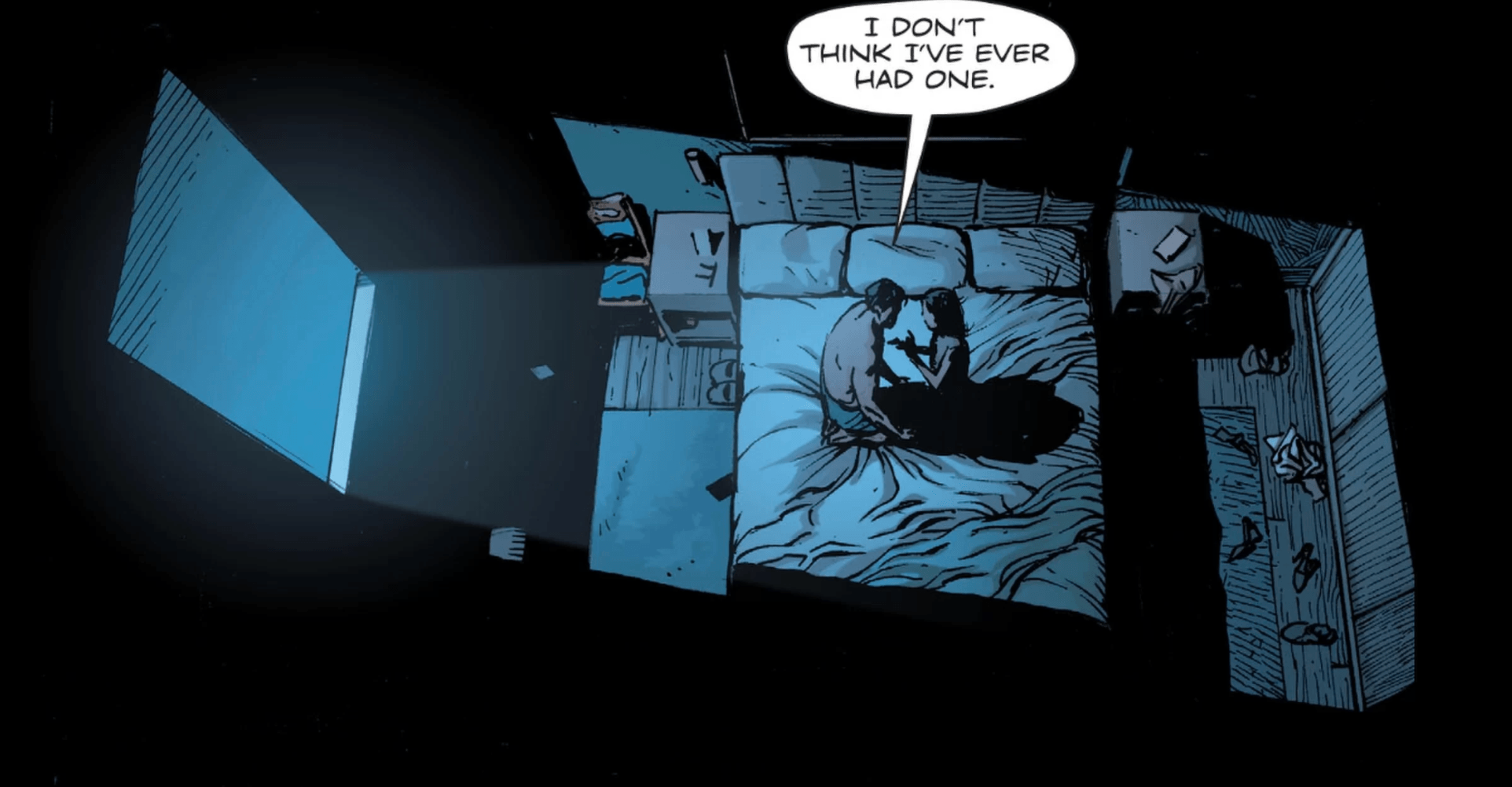 De ahí pasamos a la habitación de Lois y Clark en el DCU. Superman tiene una pesadilla, es la noche del baile de graduación en Smallville, la noche que los Kent mueren en un accidente automovilístico. Clark se despierta exaltado, flotando en el aire. Lois le dice que no recuerda la última vez que lo vio tener pesadillas. Clark responde que jamás tuvo una.